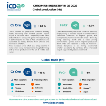 In Q3 2025 Global chrome ore production remained broadly stable, recording only modest growth, whereas global ferrochrome production and trade declined, largely owing to reduced output in Southern Africa.